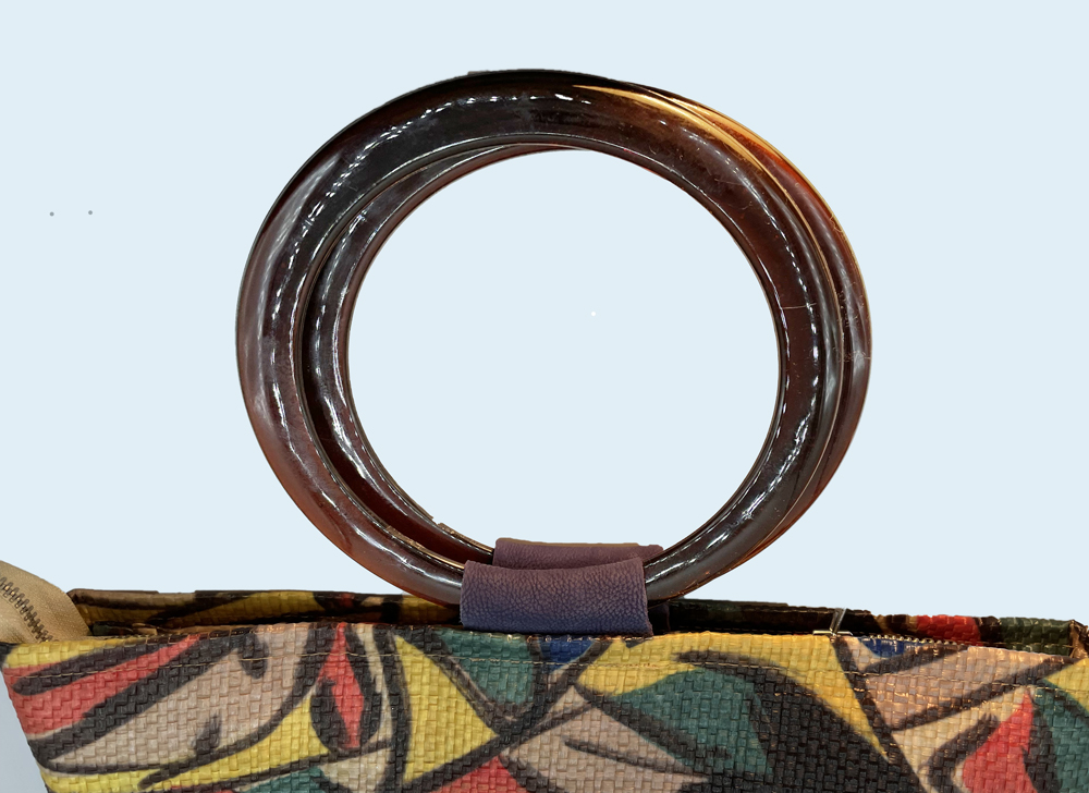 Bolos tote con asas redondas tipo carey para llevarlo en la mano o colgado del brazo. Tiene un bolsillo exterior de piel en color rojo.
