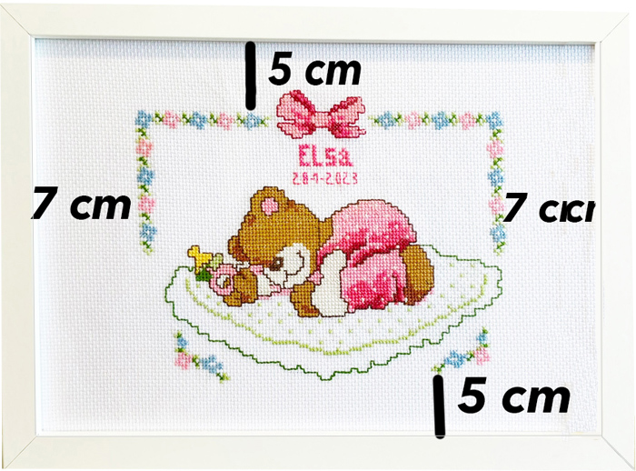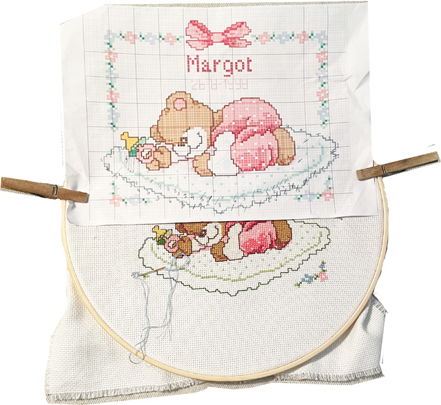 Nos comentó que ella sabía hacer punto de cruz, pero que no tenía tiempo y que quería que el bordado estuviera perfecto. Le gustaba una osita que dormía plácidamente boca abajo apoyada de lado en la almohada, una postura que los bebés suelen adoptar cuando duermen y una vez decidido el modelo, nos pusimos manos a la obra.