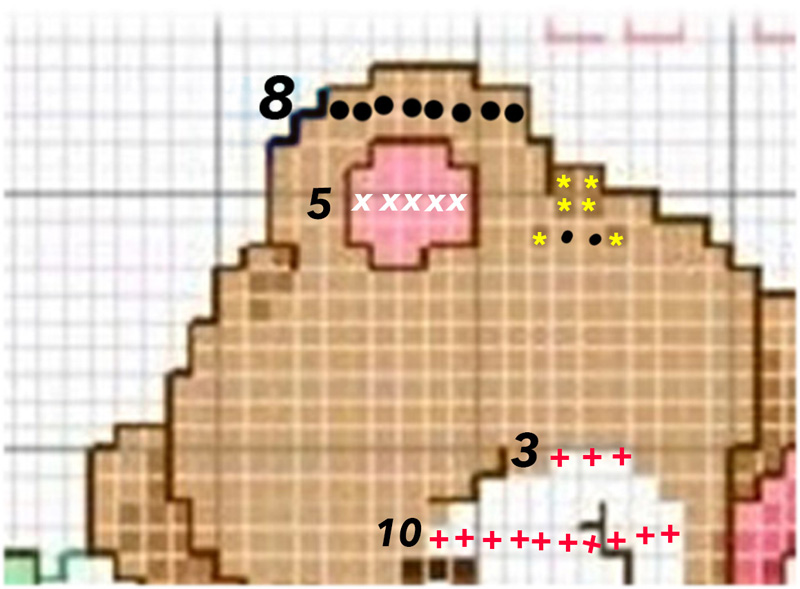 Tuvimos que ampliar el modelo para poder contar los puntos más fácilmente, pues el patrón tenía muchos cambios de colores y si uno se equivocaba y no se daba cuenta, para no deformar el dibujo había que deshacer, a veces demasiado. A pesar de todo, nos equivocamos más de una vez y tuvimos que deshacer y repetir, pero al final el bordado nos quedó perfecto y el resultado fue una osita dulce durmiendo tranquilamente.