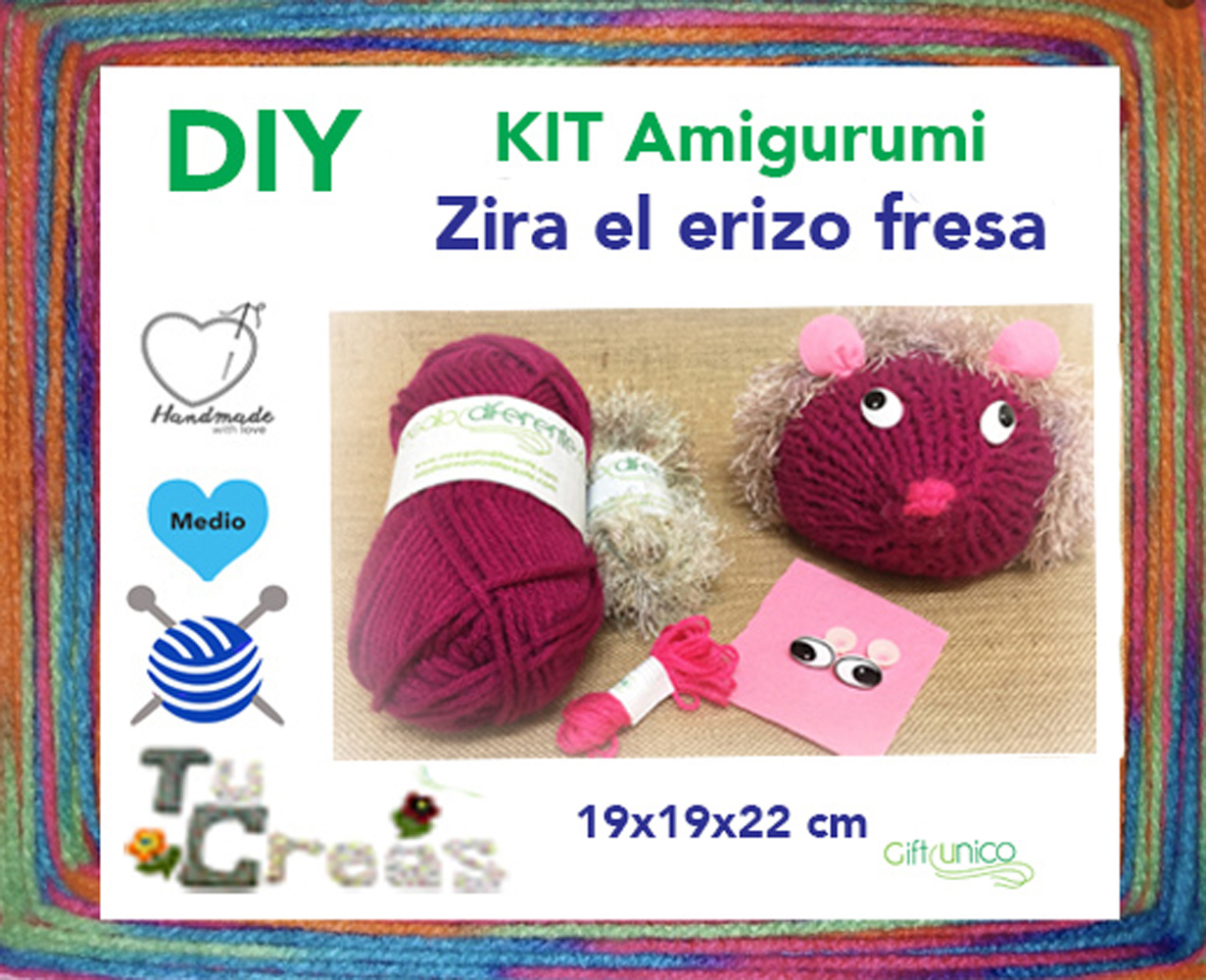 Kit completo para tejer un muñeco de lana de color fresa. La lana del cuerpo es lana de pelo jaspeada para simular las púas. Este erizo está tejido a punto de media, pero puede hacerse con las mismas instrucciones a punto de ganchillo, creando un auténtico amigurumi.