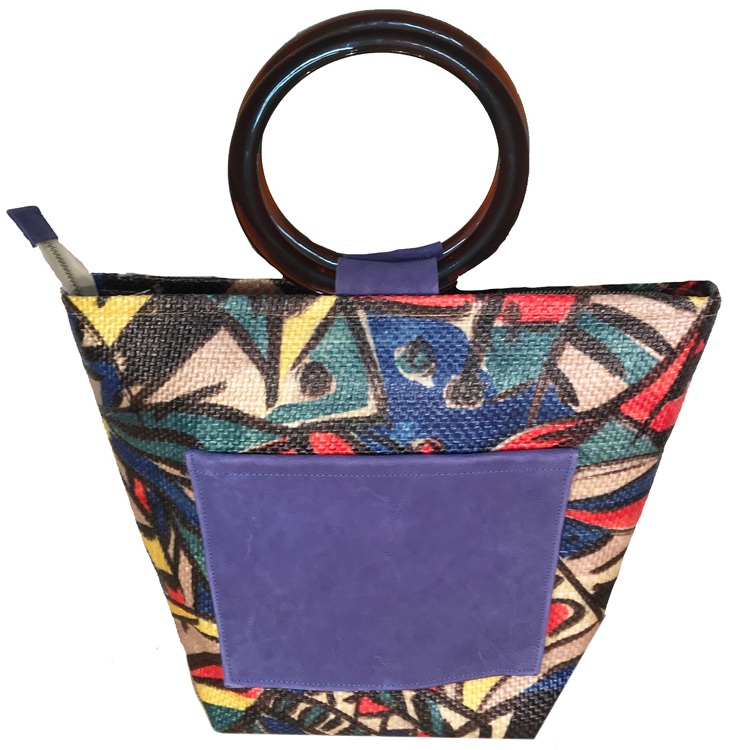 La combinación de la arpillera estampada y asas tipo carey le confiere un toque moderno por el tipo de material utilizado y clásico por la forma y las asas de carey.