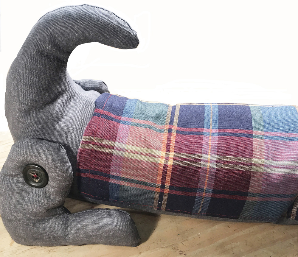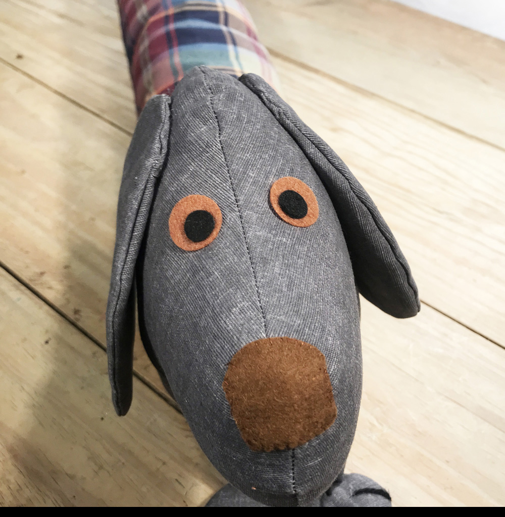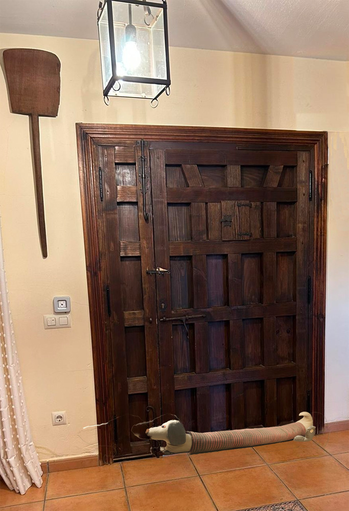 Como este corta vientos está hecho por encargo, sus medidas y forma se adaptó a las necesidades y gustos del cliente. El cliente es un amante de los perros y quería que el cortavientos tuviera forma de perro. Le gustaban especialmente los Basset, así que intentamos que la cabeza se asemejara a esta raza de perros peor el cuerpo lo tuvimos que adpatar a la medida de la puerta .